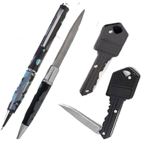 Een opvouwbaar mes dat op veel self-defense keychains te vinden is. Bij GirlyStuff in de vorm van een sleutel of een pen zodat je het onopvallend bij je kunt dragen.